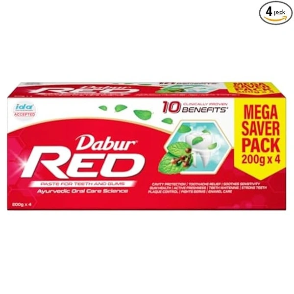 Dabur Red Toothpaste - 800g (200g x 4) | Provides Germ Protection, Cavity Protection, Plaque Removal | Prevents Gum Bleeding, Yellow Teeth, Toothache, Bad Breath