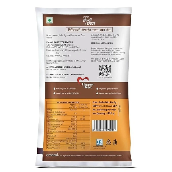 Emami Healthy and Tasty Emami Healthy & Tasty Refined Rice Bran Oil Pouch, 900g/ 825g (Weight may be vary)