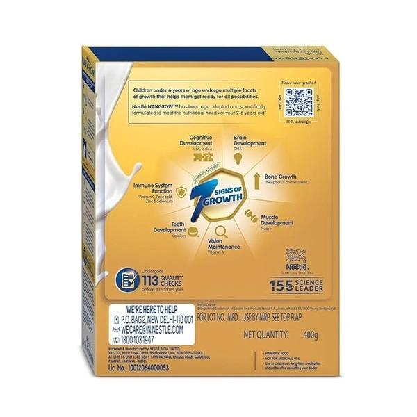 Nangrow Nutritious Milk Drink Powder For Growing Children Toddler Aged 2-6 Years | Contains DHA | Rich In Protein & Vital Nutrients | Creamy Vanilla Flavor, 400g, BIB Pack (Package May Vary)